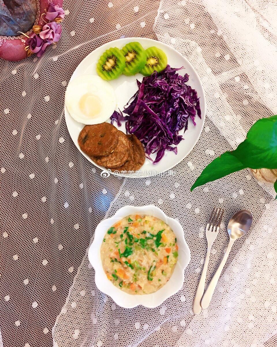 今日份早餐:紫甘蓝+煎蛋+黑豆渣饼+猕猴桃,菜粥