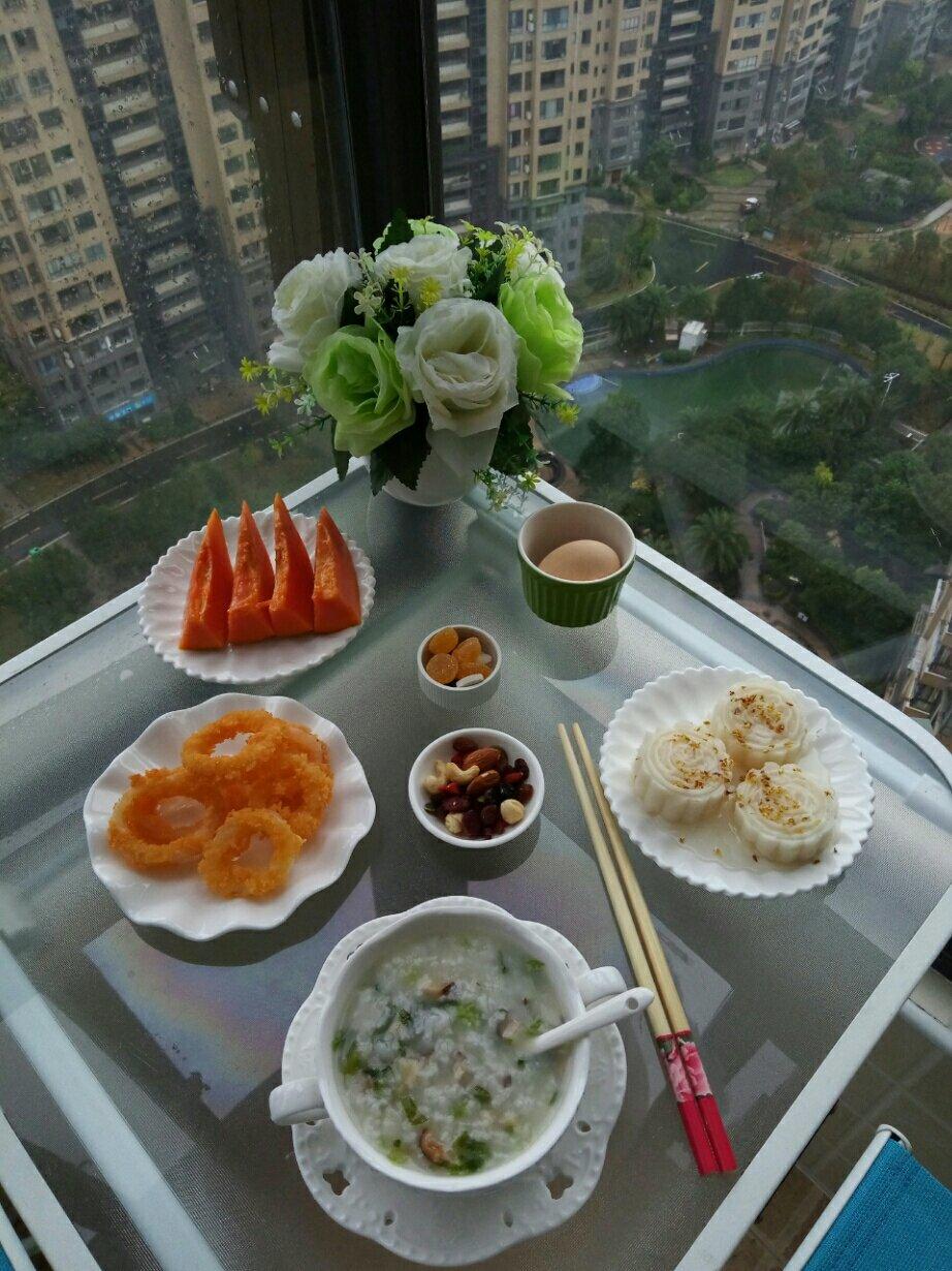 鸡肉香茹干贝蔬菜粥,香酥鱿鱼圈,桂花山药糕,水煮蛋,木瓜,混合坚果,护眼三宝,螺旋藻
