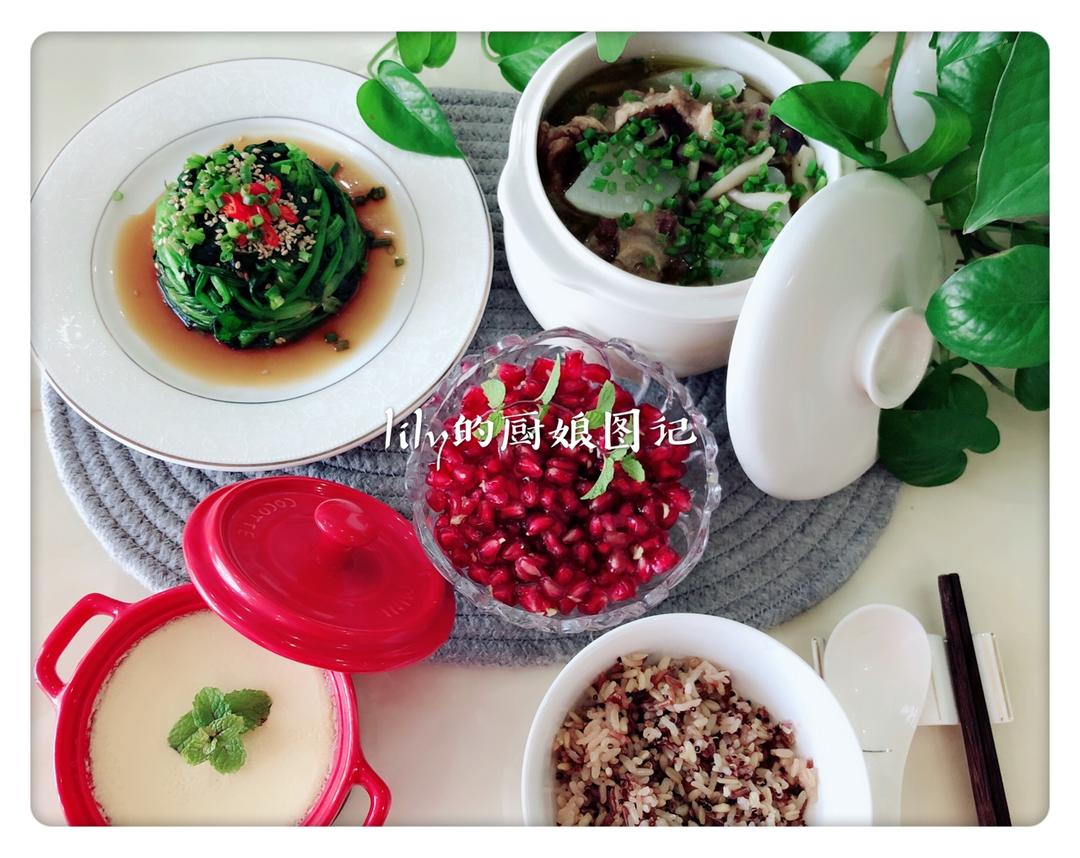 Youqibb 做过 lily的厨娘图记 今日份lily的早餐:牛尾菌菇白萝卜炖盅,用我的蘸料酱拌的焯菠菜,蔬菜吃出了牛肉味[偷笑]水蒸蛋,软籽石榴,杂粮饭饭现在是体力劳动者,得吃饱饭才有力气干活😂😂#lily的厨娘图记##早餐•2018年10月29日# 2018-10-29