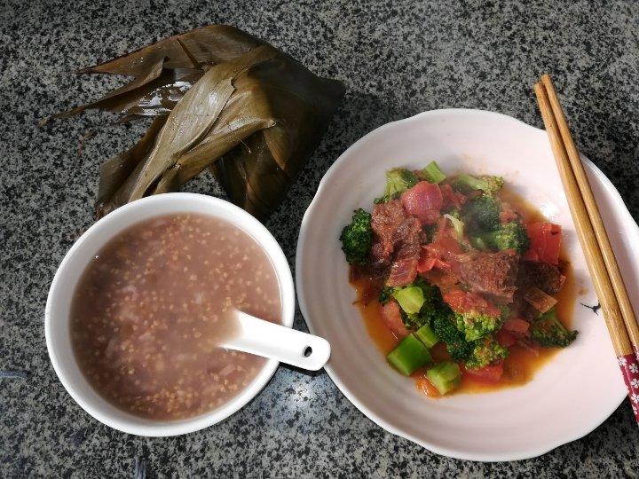 番茄西兰花炖牛肉+糙米粽子+八宝粥