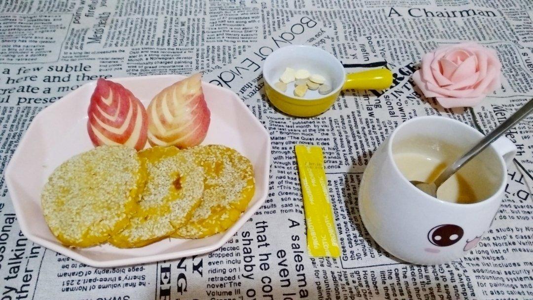 每天都是新的开始,天气变凉说明冬天才真正开始[调皮]大家做好保暖哦!宝贝早餐分享:红薯饼、苹果、水果味蛋白饮、纽崔莱营养片、益生菌