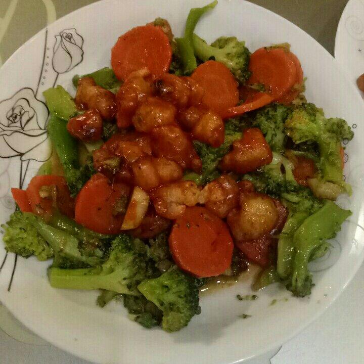 西蓝花加淀粉炸了一下,然后加番茄酱一炒,再和西蓝花,胡萝卜炒到一起。颜色更好看一些,扇贝也没下来太多水。