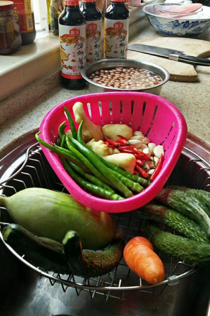 食材:鲜黄瓜,青萝卜,胡萝卜,仔姜,大蒜,青红辣椒,花生豆共计五斤。