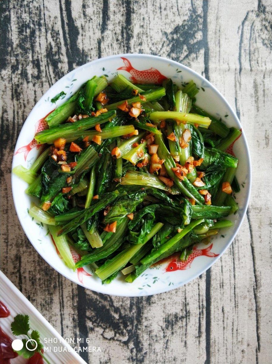 和作者的做法略有不同,我是切好油麦菜后用水焯了下,稍后再起锅爆香蒜末加蚝油填一点点水稍微熬一下出锅淋在油麦菜上,超级简单味道很好