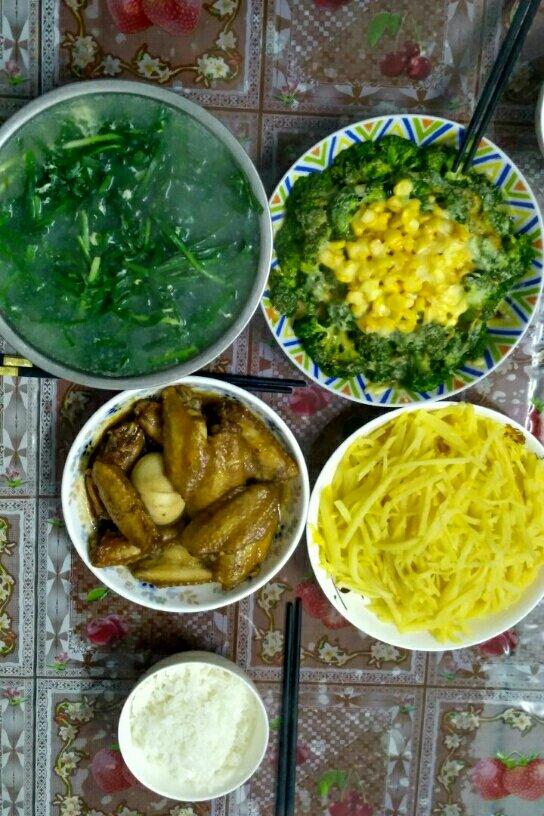 快菜蛋花汤,芝士焗西兰花玉米,可乐鸡翅,咸蛋黄炒土豆丝