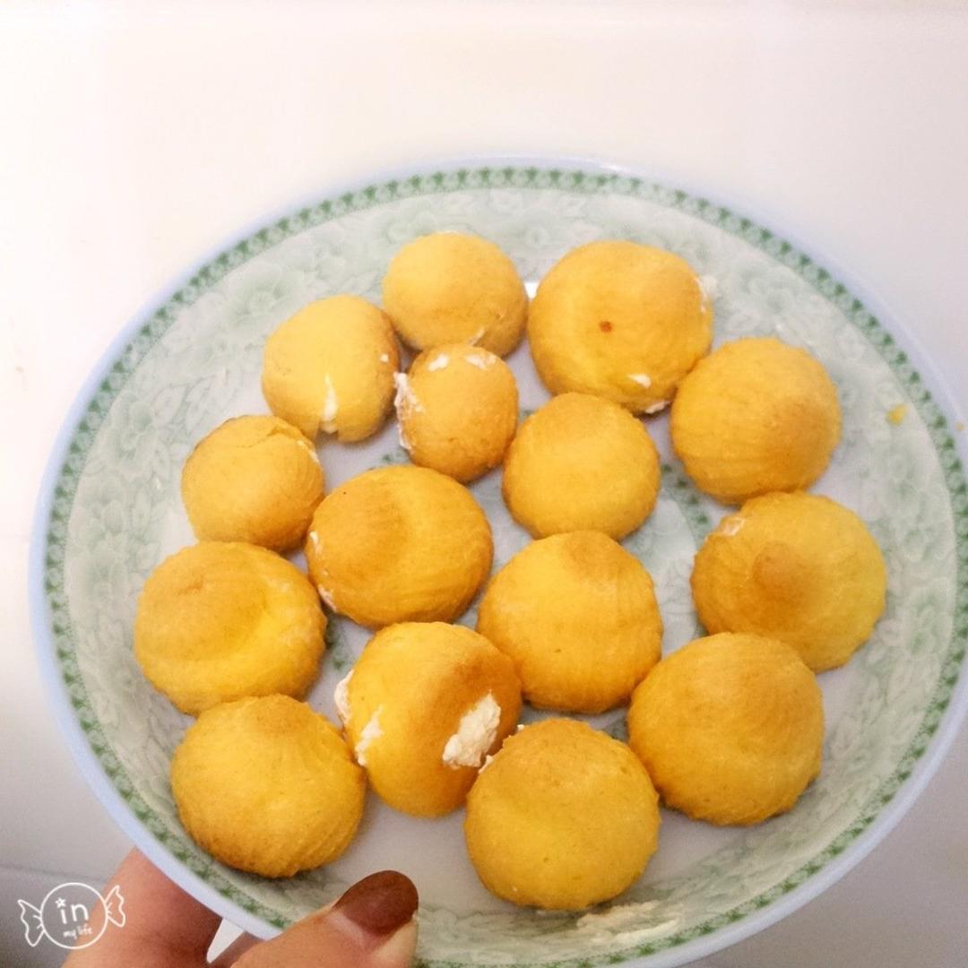 待到此时爱以微息 做过 奶油泡芙 黄油80,低粉100,鸡蛋3个(没用完)盐,糖1小勺,水160,淡奶油200,糖20,210°15分钟转180°20,泡芙里有些不熟,第一次做,冻了一点,化冻后一样烤 2019-03-28
