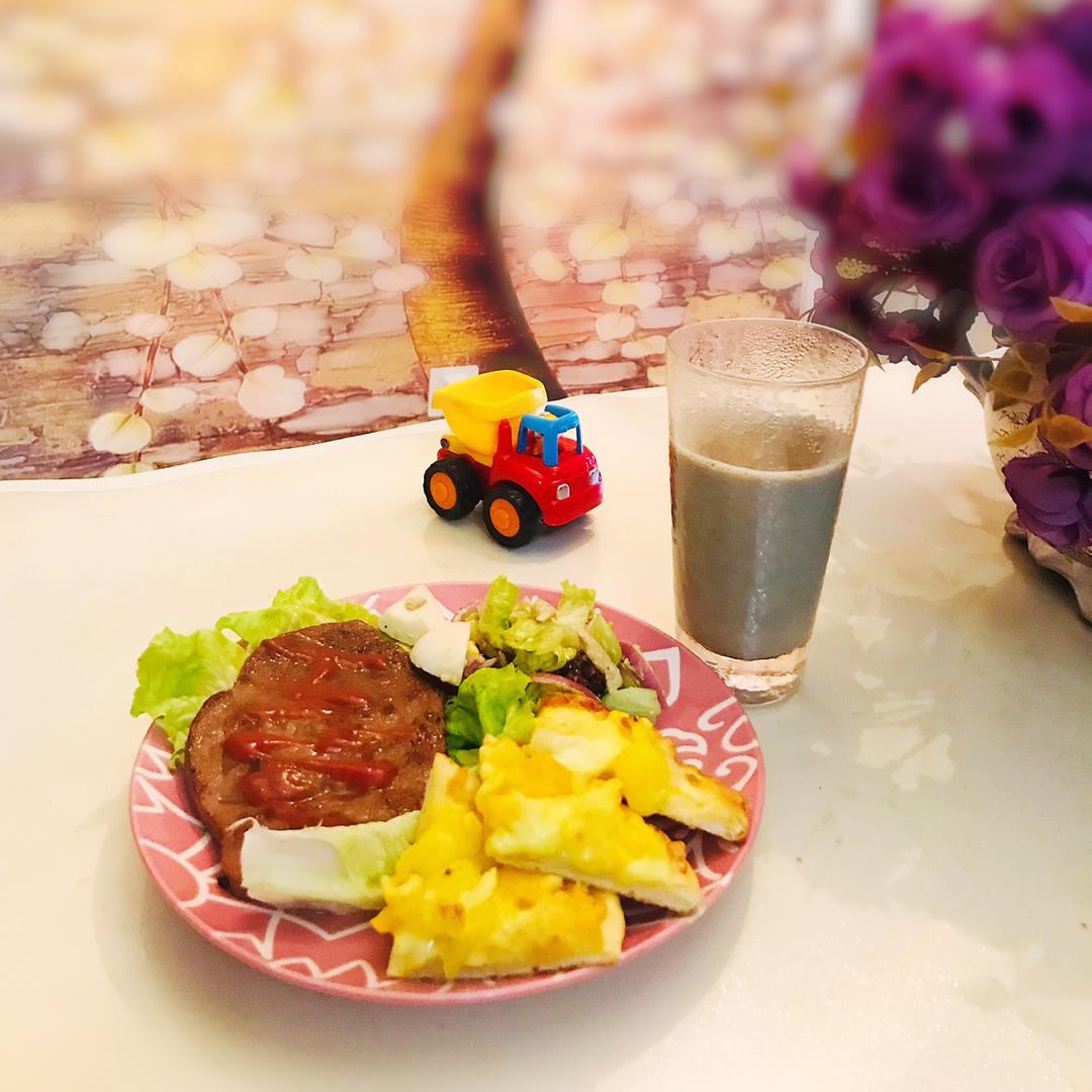 煎牛排 水果披萨 蔬菜沙拉 黑芝麻花生豆浆