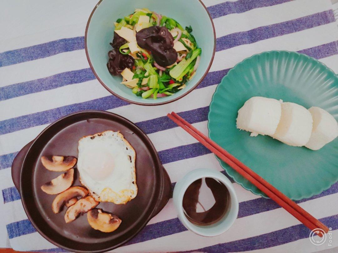 煎蛋时顺手煎了两颗小蘑菇,奶香馒头,微温的凉拌蔬菜,晨,安