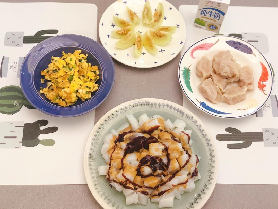 葱花炒蛋,胡萝卜玉米饺子,混酱猪肠粉,小香瓜,牛奶