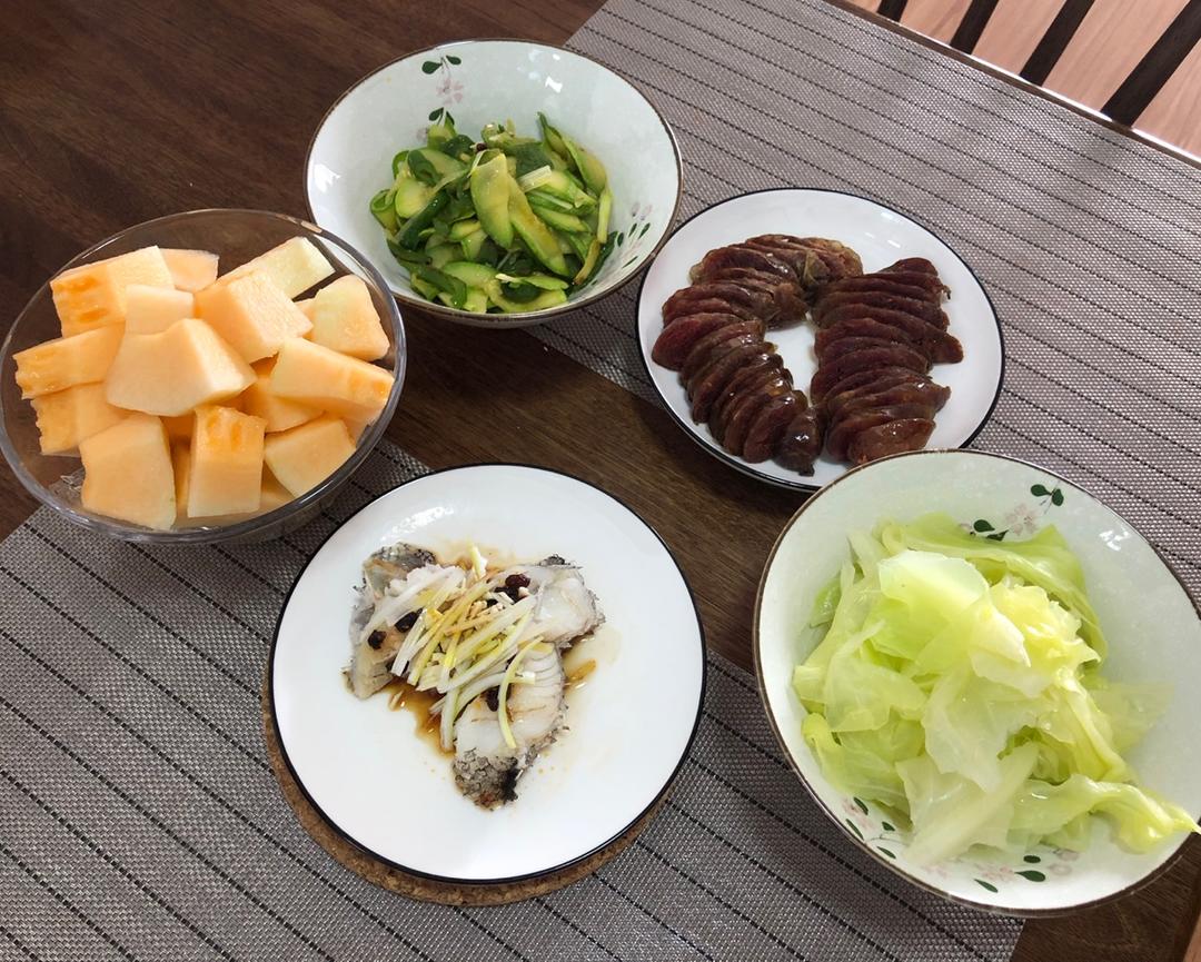 午餐,豆豉蒸鳕鱼,广味香肠,清炒西葫芦,清煮包菜。