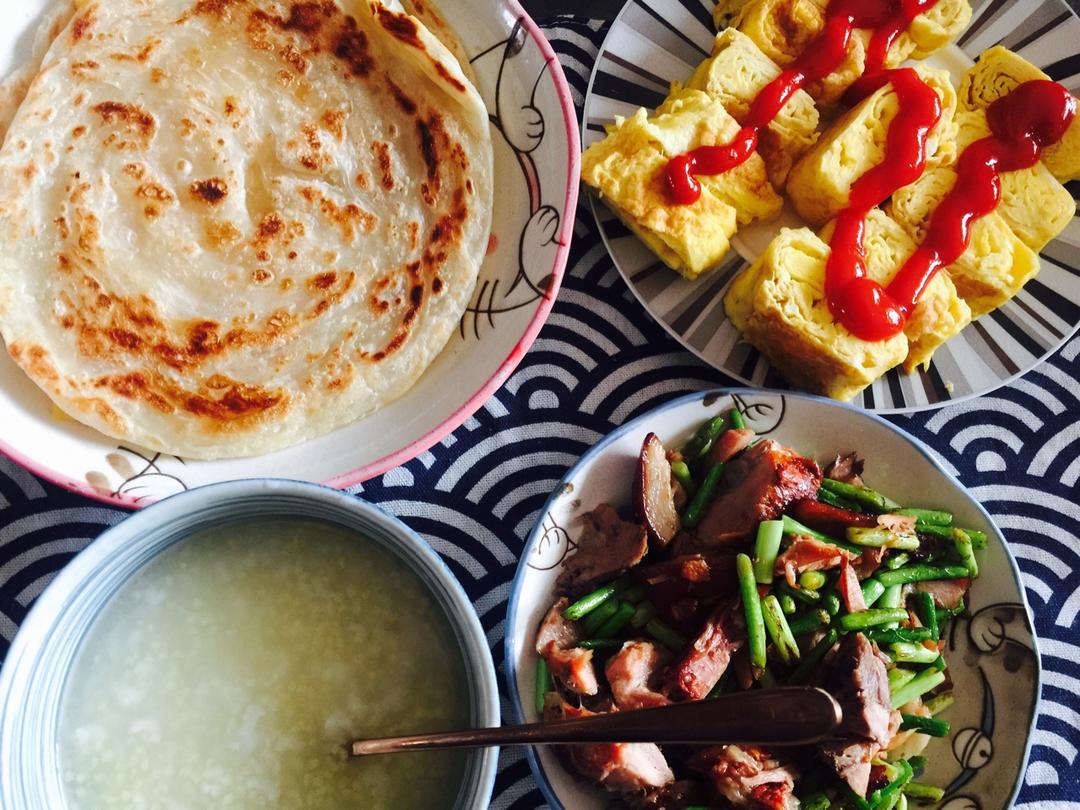 康福手抓饼、玉子烧、蒜薹肘子肉、二米粥
