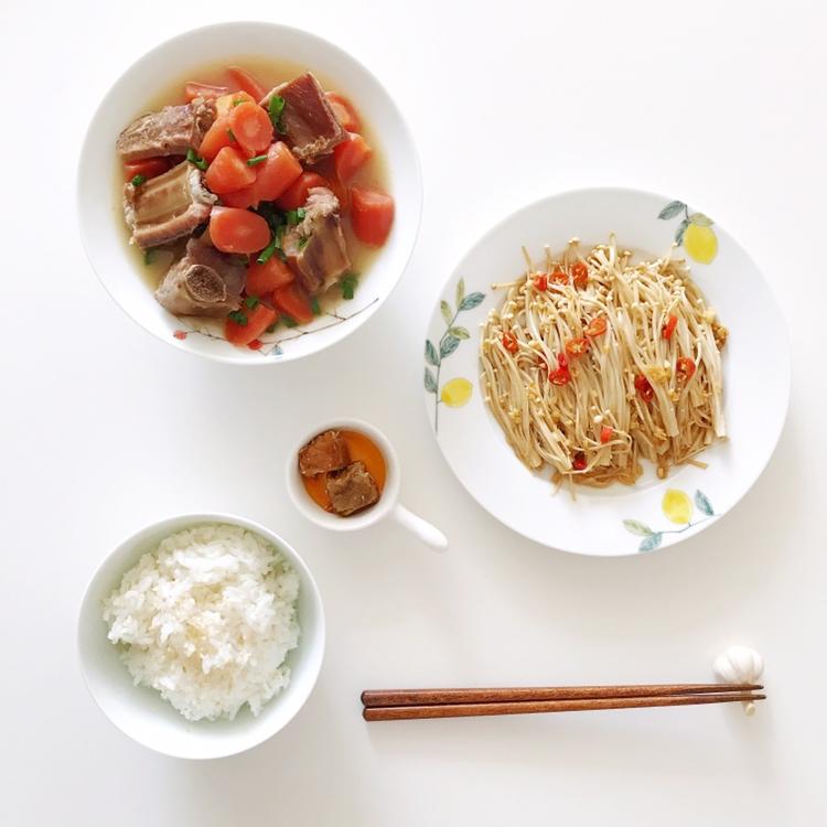 午饭一人食:蒜蓉烤金针菇、腊排骨炖胡萝卜、米饭、豆腐乳。