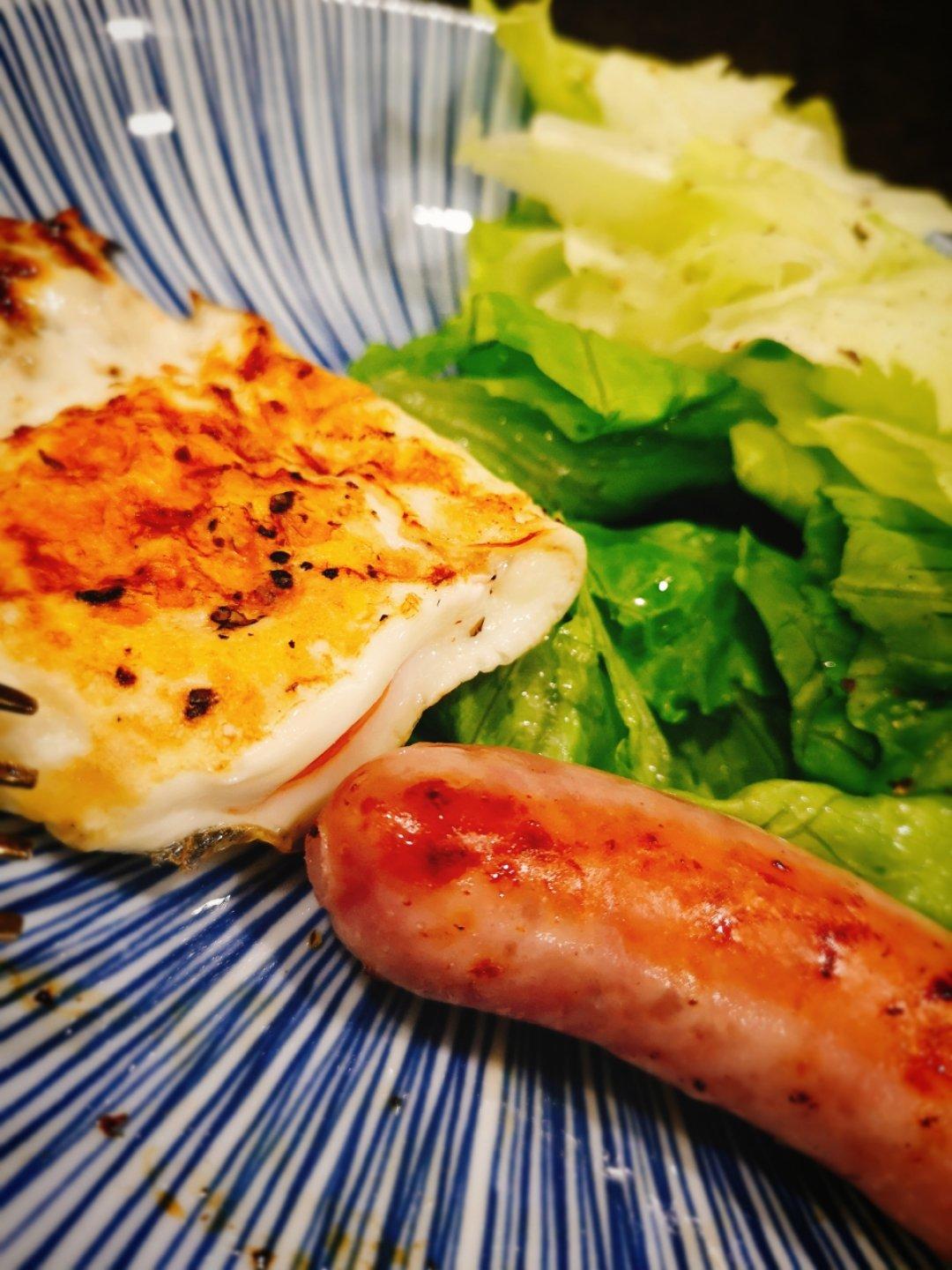 早餐:无油荷包蛋,香肠一根,生菜4片