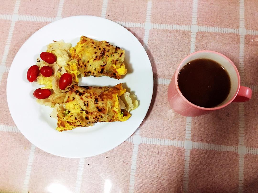 餐品:生菜卷鸡蛋煎饼,红豆薏米水