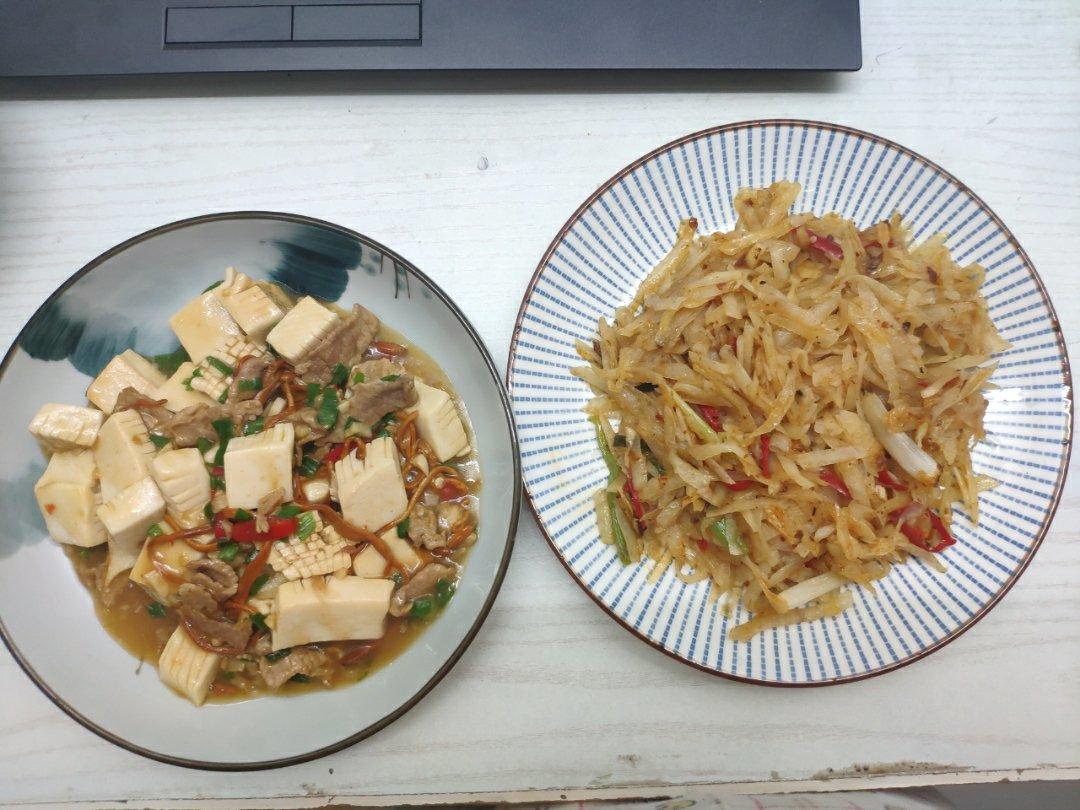 肉片炒神仙豆腐。酸辣土豆丝