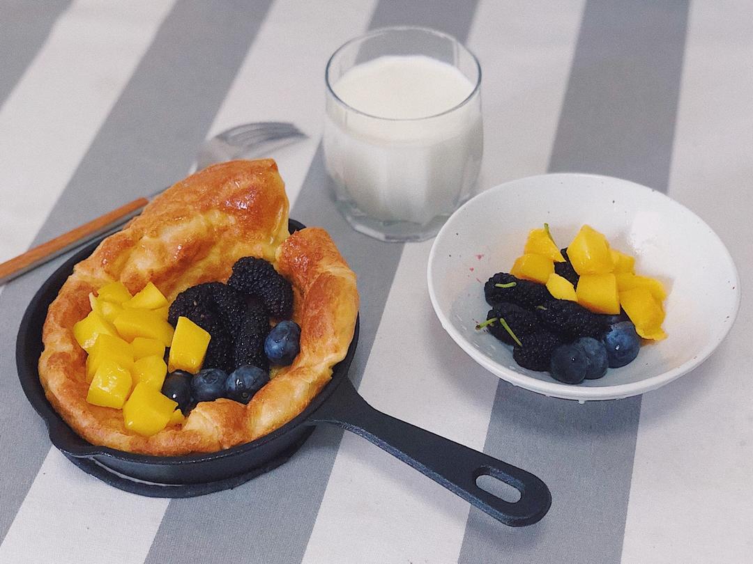 Jane毛毛毛 做过 一个鸡蛋的DutchBaby咸甜皆有! 记录一下方子的比例很好用~鸡蛋52g+牛奶52g+面粉36g+黄油3g(油量根据自身口味增减,试过5g就会油了,这个量刚好适合我)根据甜咸可加少量糖或盐(盐不超过1.5g,会咸)烤箱200度16min烤好再放一会儿出炉,上色、口感刚刚好👌🏻 2019-05-17