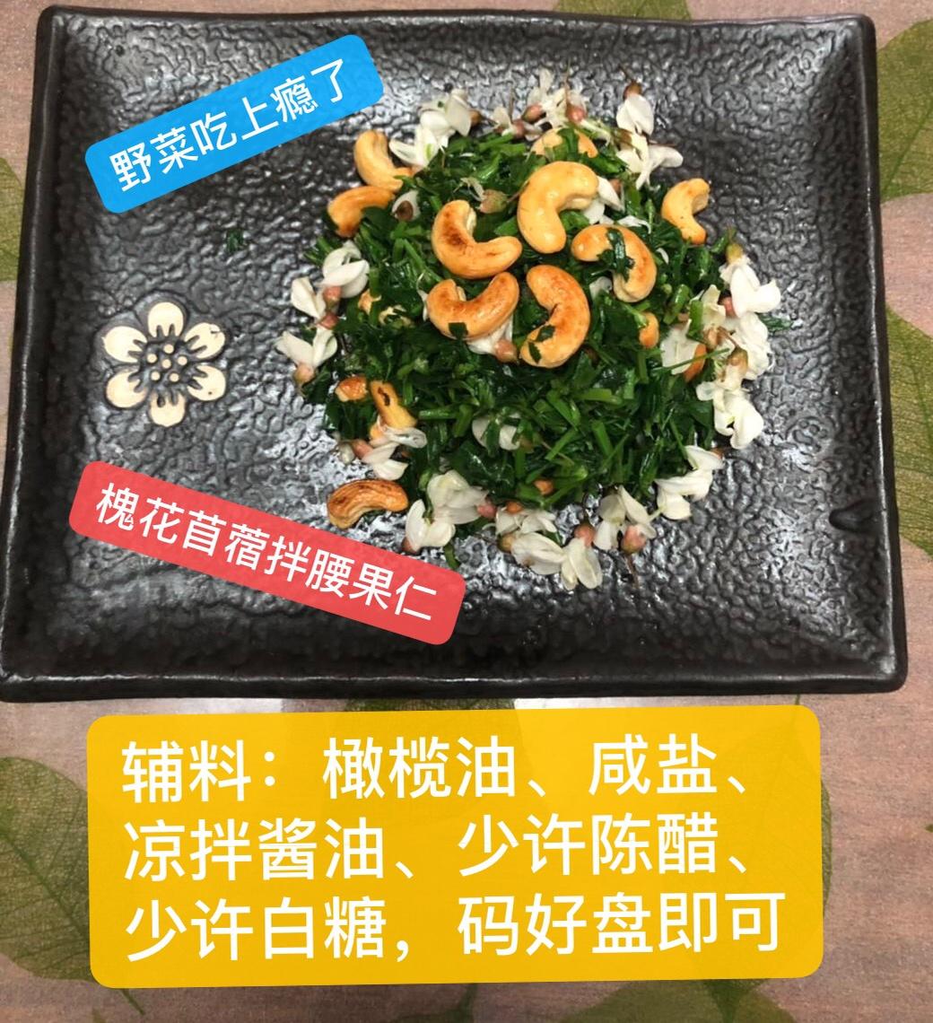 这段时间吃野菜野花上瘾了,如下图的苜蓿槐花腰果仁,槐花是昨天刚从槐花🌲上摘得,苜蓿冰箱里冷藏了三天依然很鲜嫩,拿出来苜蓿用开水一焯,用手挤出多余水分,切碎,拌入洗干净的去除了花茎的槐花,今天手懒,没放大蒜和葱花,直接搁了盐、老陈醋、生抽、白糖、橄榄油和芥末油少量,油炸好的腰果仁,用筷子搅拌好,码盘儿即可,主食是槐花苜蓿不烂子(山西人这样叫,学名没查过,估计没有吧,属于地方小吃)各种佐料一一拌入不烂子中,味道美极了!