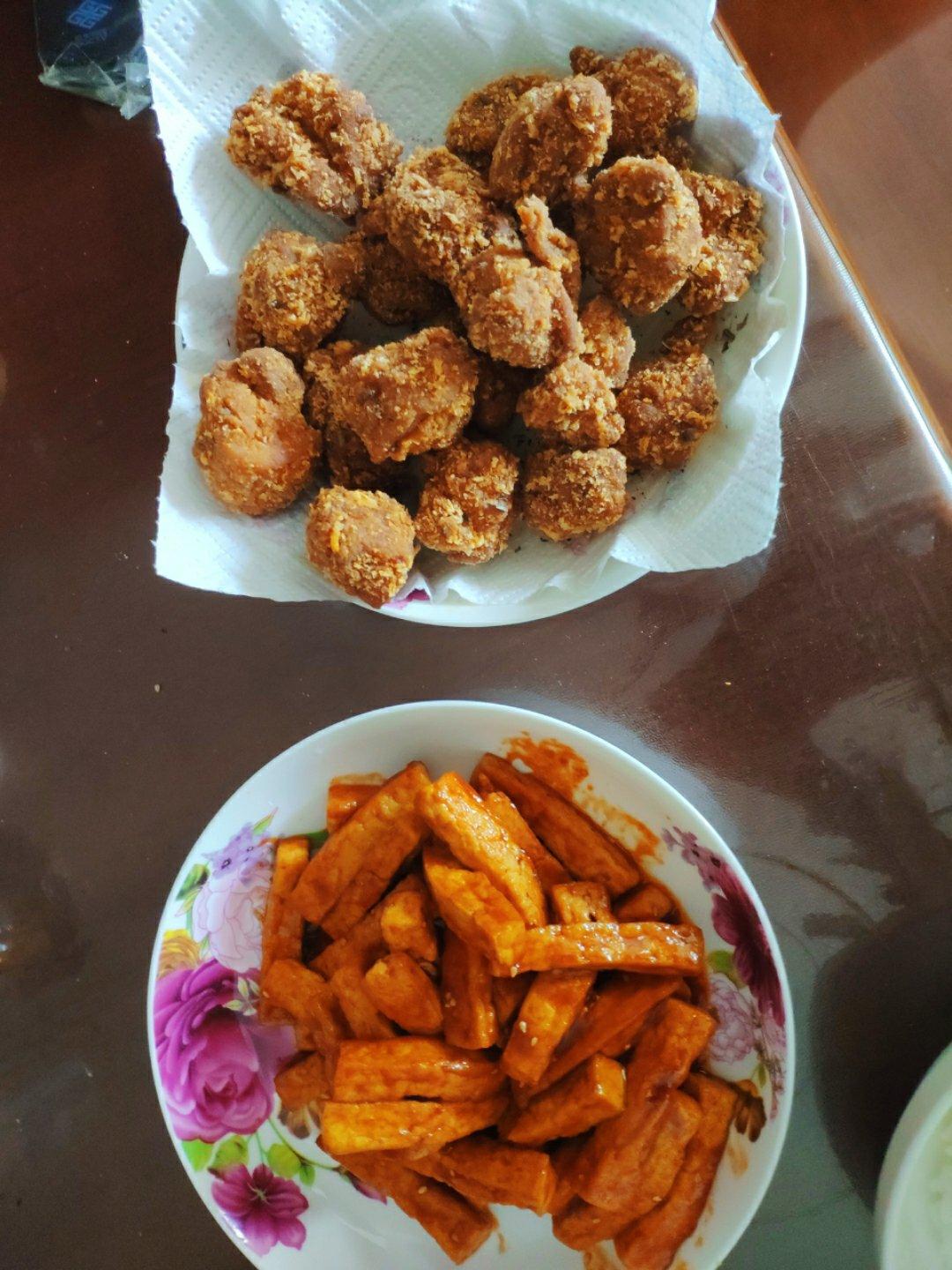 鸡块切的大块,按照盐酥鸡的方法做的,没有九层塔,撒了些椒盐和干罗勒。下面的豆腐是煎完,调了个酱炒一下裹匀酱汁。