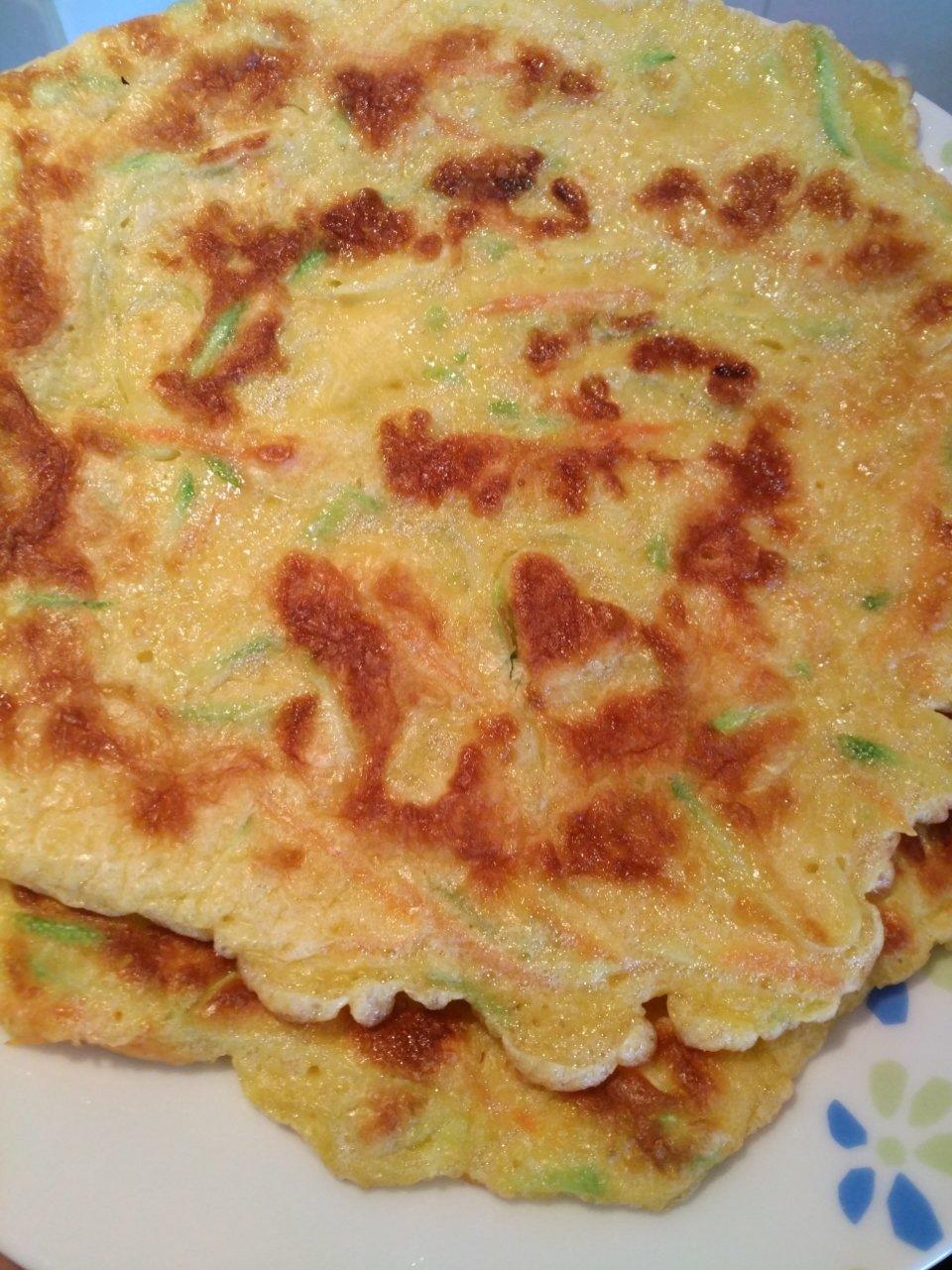 GailQiu 做过 早餐•2019年5月22日 #早餐•2019年5月22日# ☞角瓜胡萝卜奶香鸡蛋饼*角瓜和胡萝卜插丝,加两个鸡蛋,一点点盐和糖,一勺奶粉,半杯面粉,边加水边调成浓稠的面糊。*平底锅中小火、少许油,每次倒些面糊,抹匀,上面没有液体时翻面,两面烙至金黄色,蓬松轻盈,就可以啦!*今早烙了三张饼😋 2019-05-22
