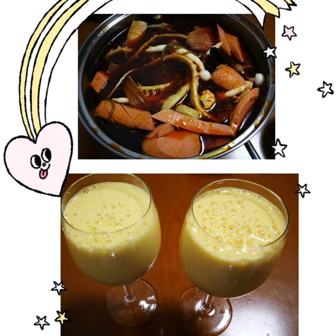 前天吃鱼头火锅打包回来的汤料,今天煮了一锅冒菜,再配点芒果奶昔,火锅解暑佳品。