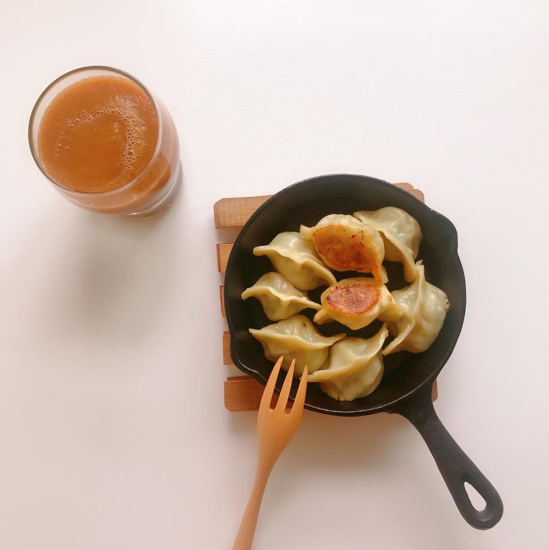 早起突然想吃煎饺,动手包了些,打了一杯西芹胡萝卜桃汁,满足……