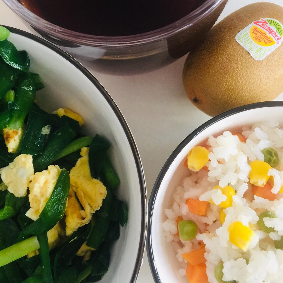 韭菜炒蛋,蔬菜饭,一大杯黑咖啡,猕猴桃