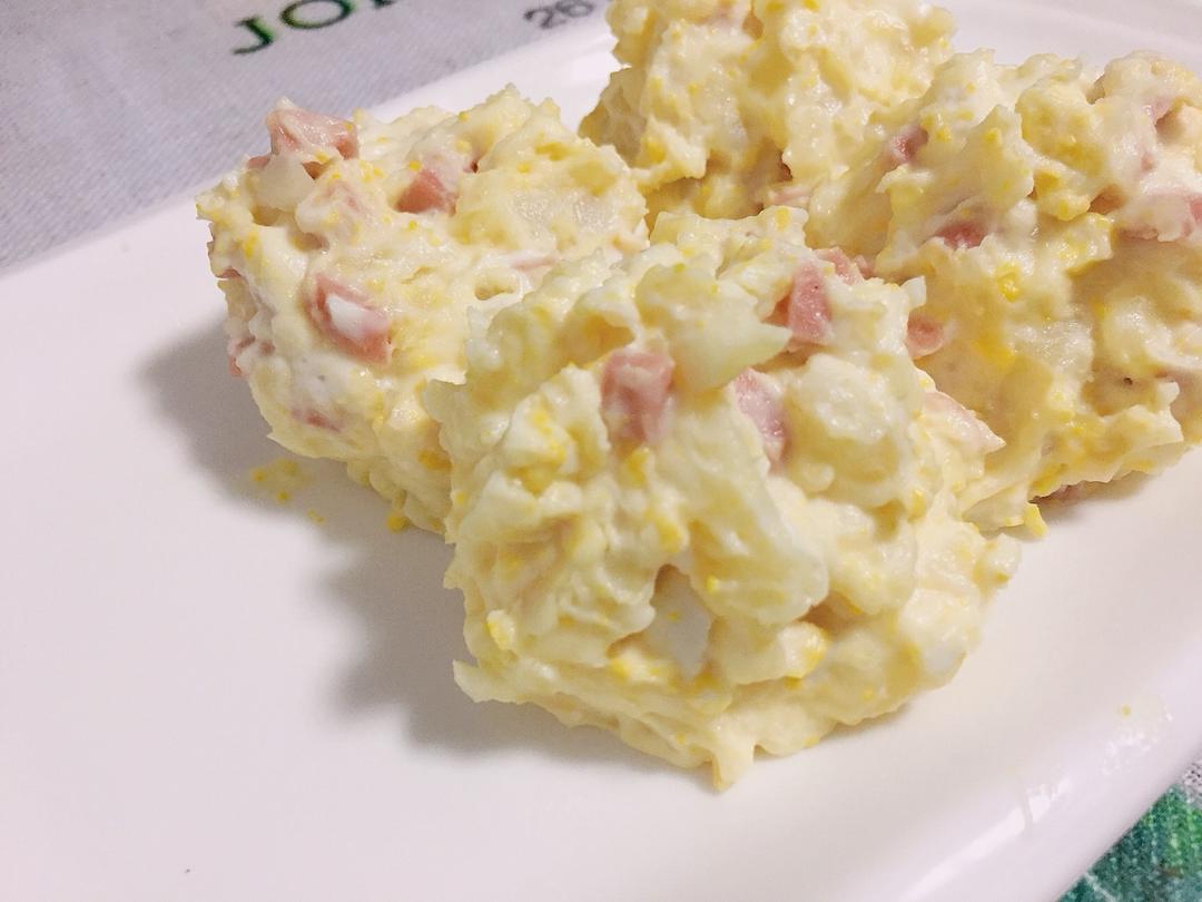 小点的土豆两个,鸡蛋一个蒸熟,加一根火腿肠,适量的盐,100克沙拉酱,搅拌均匀即可。