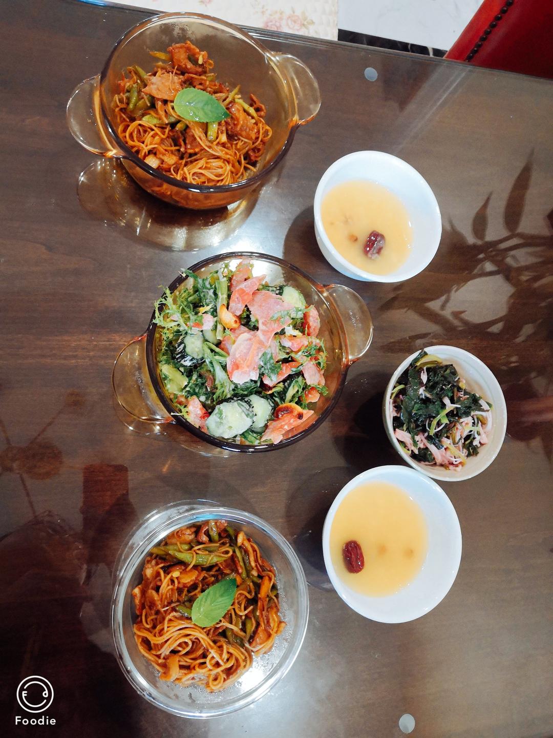 大病初愈后的第一餐,还是不好吃太油腻,做了两个凉拌菜,豆角焖面,红枣白米粥,坚果沙拉,金针菇红菜