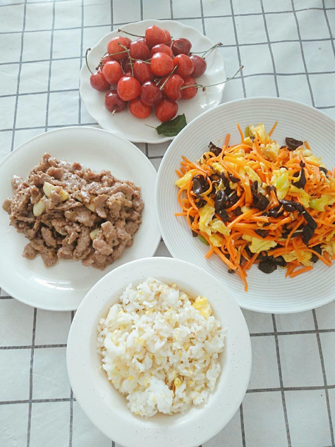 炒饭+胡萝卜炒木耳鸡蛋+黑胡椒蒜粒牛肉+🍒