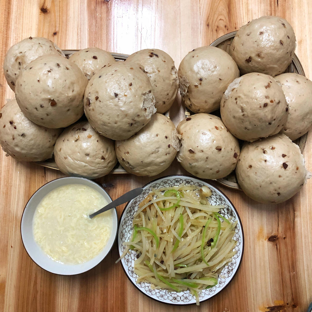 红糖红枣馒头,青椒土豆丝,鸡蛋面疙瘩