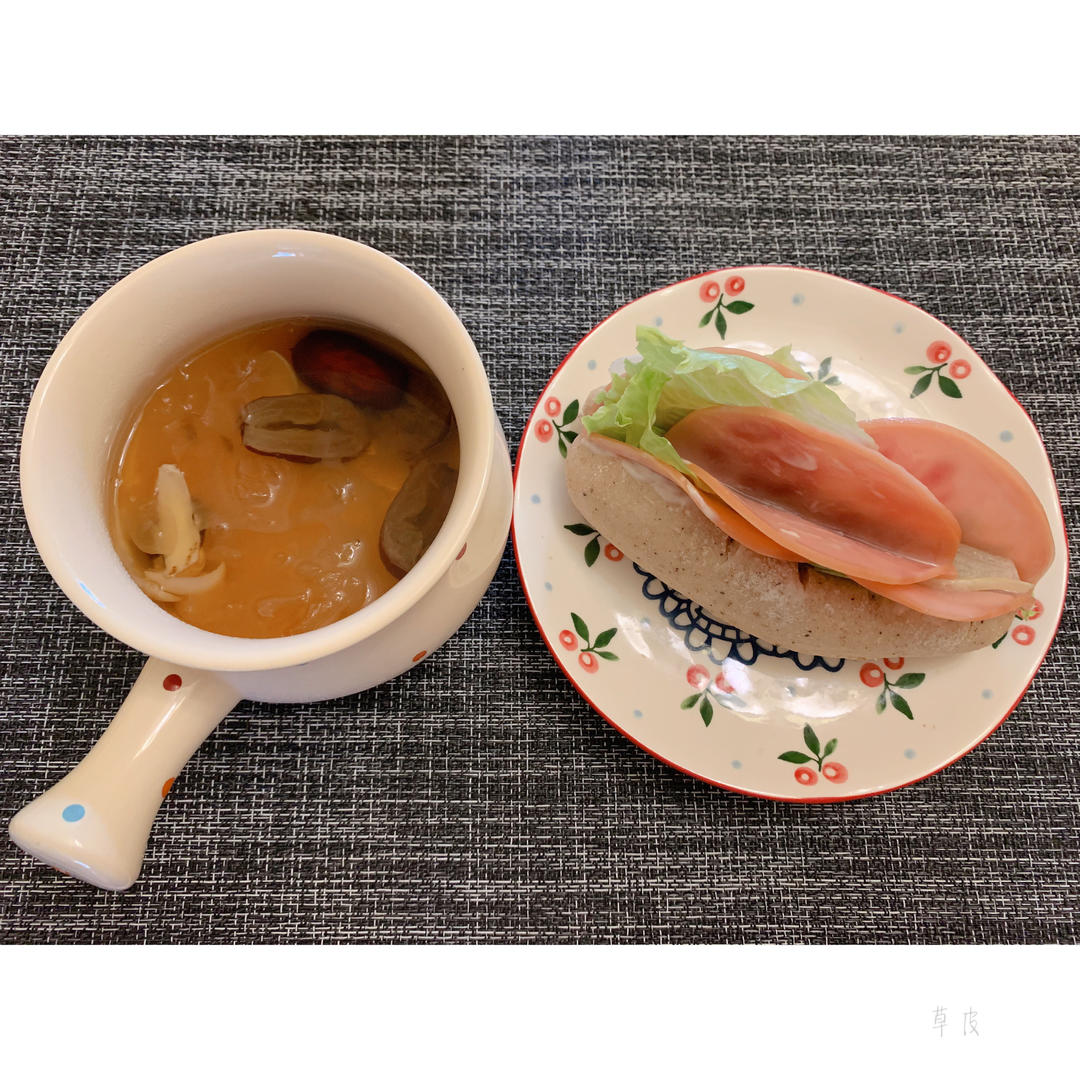 午餐:红枣银耳百合汤+加了火腿生菜的红茶全麦面包