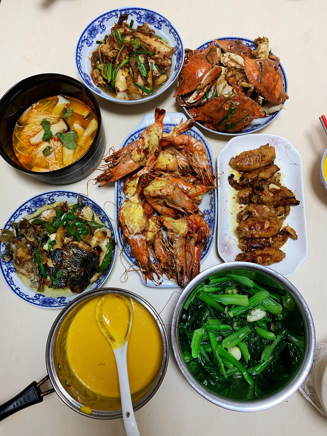 黄油芝士焗大虾,姜葱焗三目蟹,豆豉汁蒜头焗花斑,美极鱿鱼筒,姜片煎鸡翅,酸汤杂菌,上汤菜心,淡奶南瓜汤