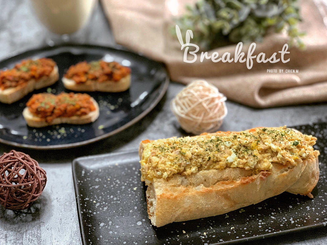 还是工作日早餐,但我要吃的优雅!感觉自己已经在放假了!😠剩的半根法棍做了金枪鱼三明治,自制意式肉酱塔