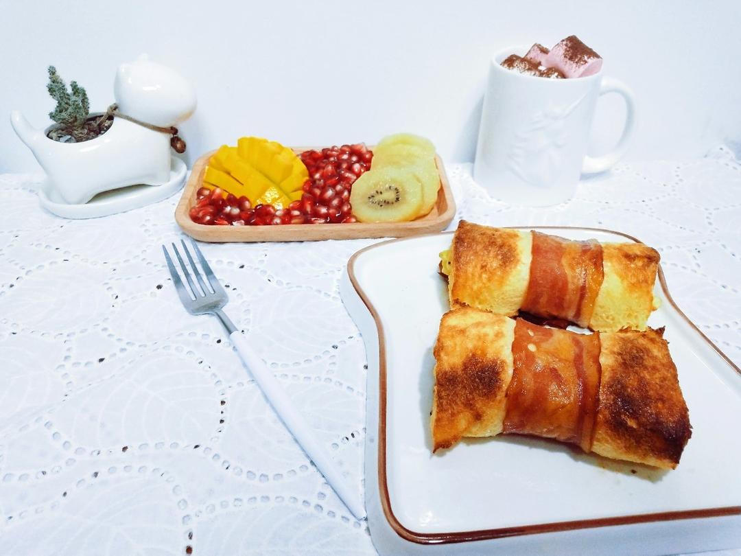 月月是肉菘妈妈 做过 早餐•2019年11月4日 肉菘家早餐🌽 ♬ 2019-11-4早上好呀[愉快]我可爱的土司卷烤焦了点[偷笑]🌞 鸡蛋沙拉土司卷🌞 棉花糖热巧🌞水果小拼盘 #早餐•2019年11月4日# 2019-11-04