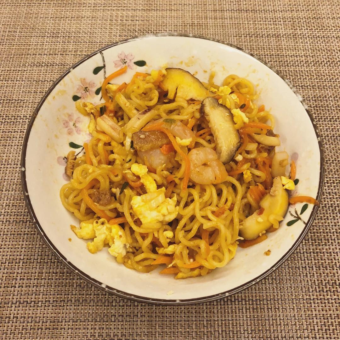 用了辛拉面!切了香菇片,放了鸡蛋,虾仁和鱿鱼圈,调好汁倒进去一起炒,蛮好吃~