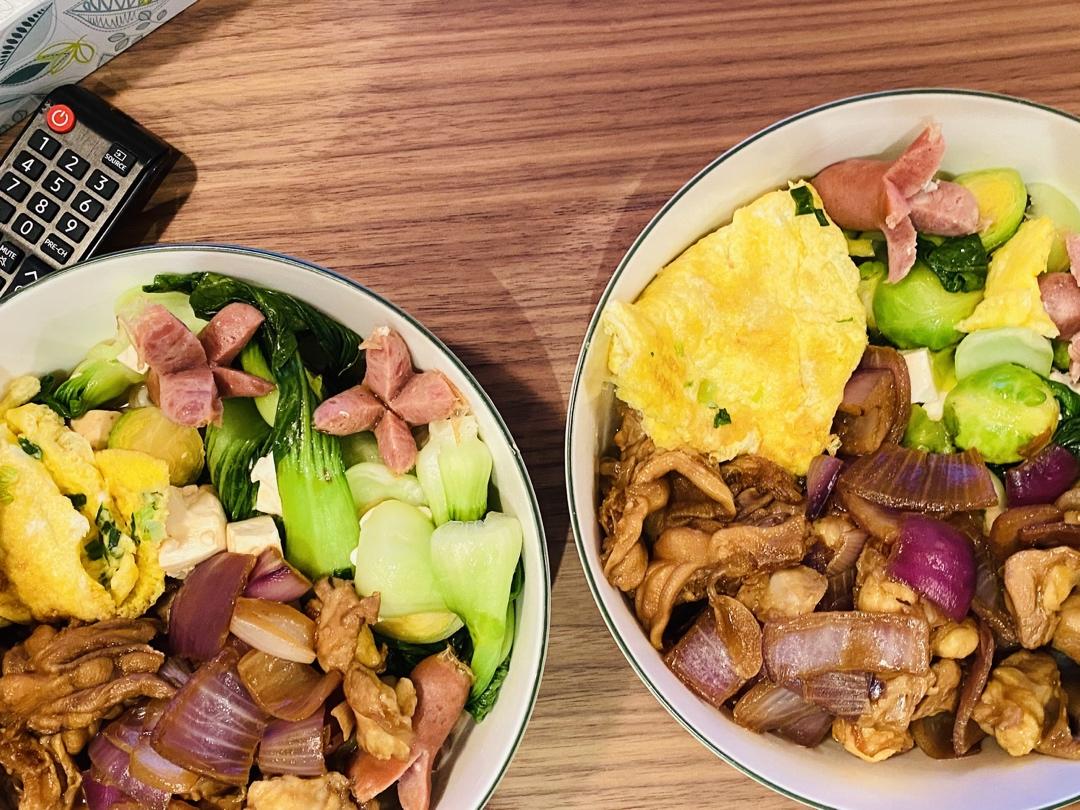 落落要爬墙 做过 快速午餐 洋葱鸡丁:洋葱、鸡软骨(脆脆的)、酱油青菜炖豆腐:上海青、绢豆腐、亲亲肠、盐煎蛋:蛋最后把它们和煮好的阳春面混合。用青菜炖豆腐的汤作面汤。#快速午餐# 2019.12.25 2020-01-05
