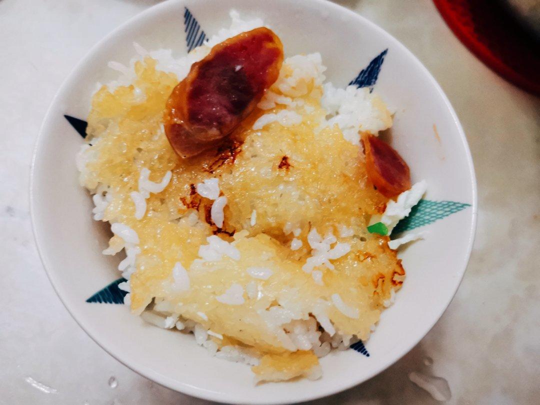 淋入了花生油,小火焖饭,锅巴不硬不软,香喷喷。