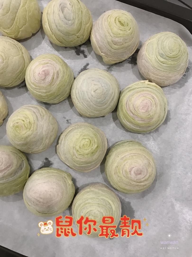 第一次做四种颜色的蛋黄酥就成了,很大的鼓励哦,可惜绿色粉放太多,其他粉没放够