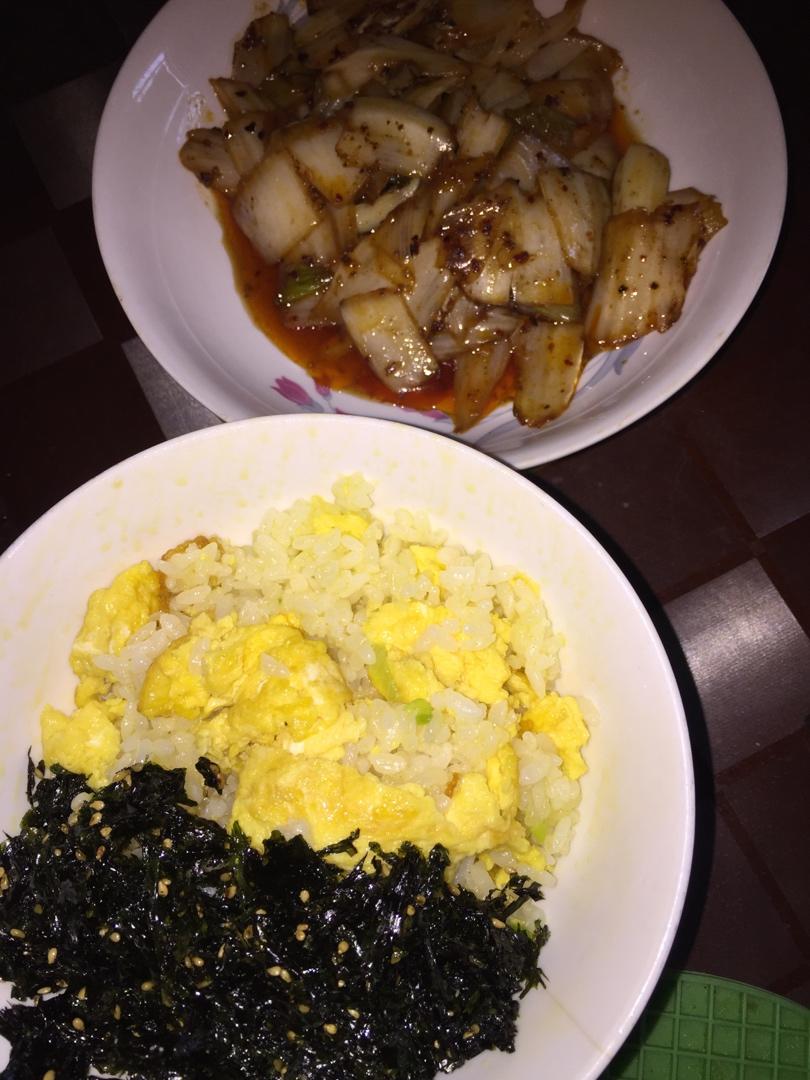 早餐:酸辣白菜、海苔碎配鸡蛋炒米饭