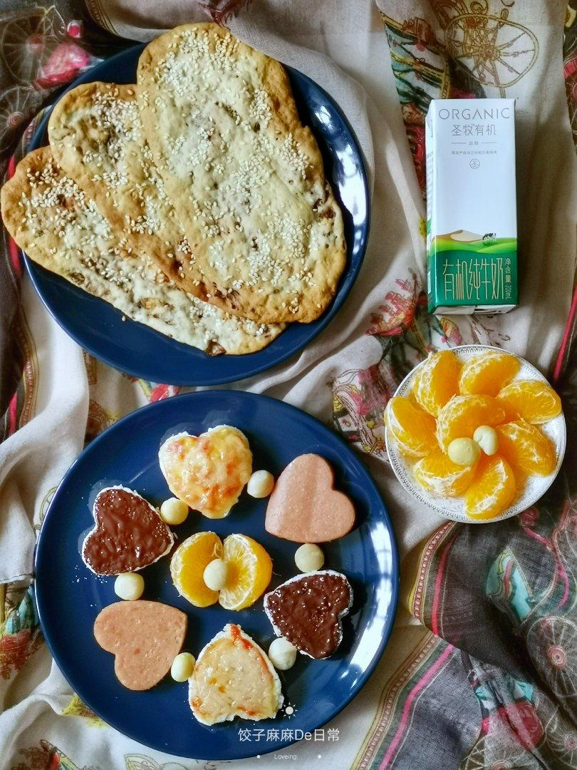 🍳早餐餐单:爱心花式烤馒头,自制牛肉榨菜锅盔,蜜柑,牛奶,坚果 #早餐•2020年2月14日# #宝宝辅食分享#