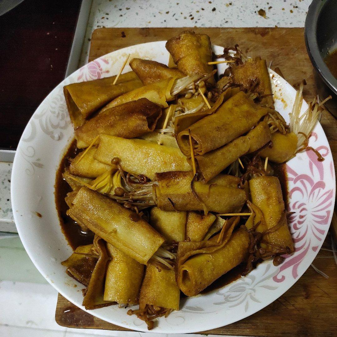 倩老公 做过 豆皮卷金针菇 首先需要干豆腐250克,金针菇一把,爱吃也可以多放把干豆腐切成长方形,金针菇切掉根部,把金针菇用干豆腐卷上,用牙签固定,放入锅里用小火慢煎我用的家常锅(最好选用平底锅)煎至两面金黄第三步就是碗中放入一勺老抽,两勺生抽,50克白糖,一勺浓缩鸡汁,半碗清水适量差不多250毫升吧!搅拌均匀放入煎好的金针菇,倒入调好的,料,大火收汁,出锅,金针菇豆卷完成,开吃 2020-02-20