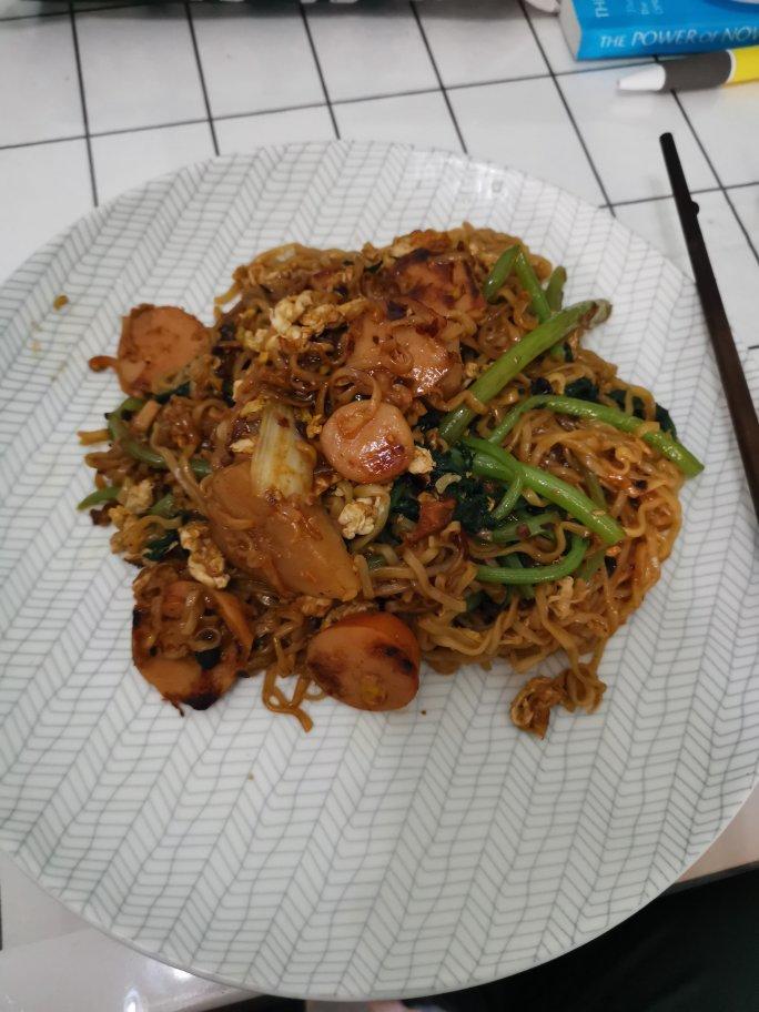 下油,快炒鸡蛋,可加入火腿肠/午餐肉,加面,加煮好的青菜(加面加菜时调成中小火,避免糊锅)