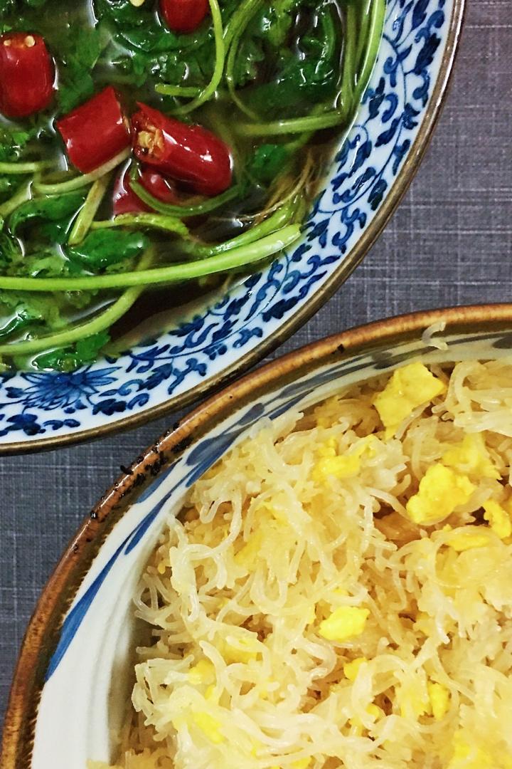 鸡蛋米丝+凉拌香菜,娃给老爹准备的晚餐,笑曰:这是绝配!😝😝