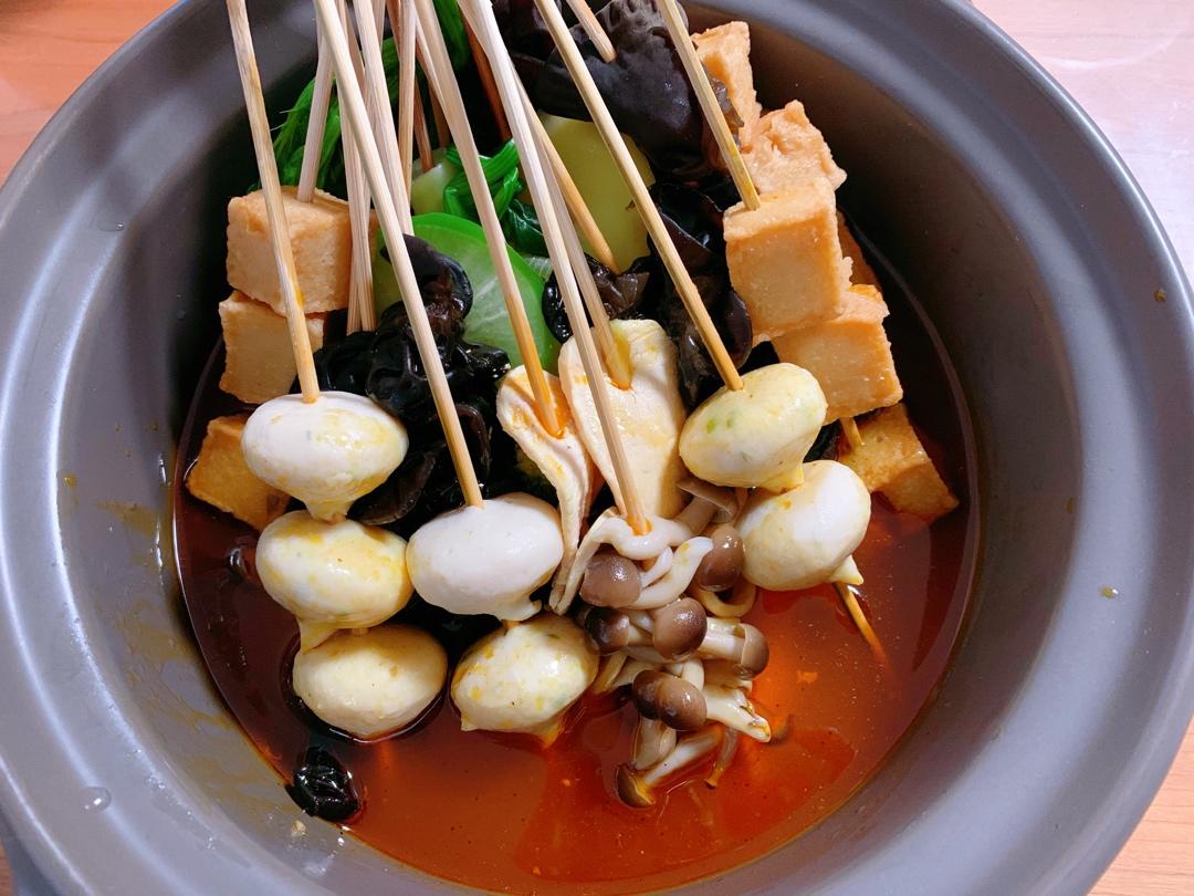很简单,把东西煮熟了串起来,然后用鸡汤、红油、花椒油打底即可。就是很麻烦