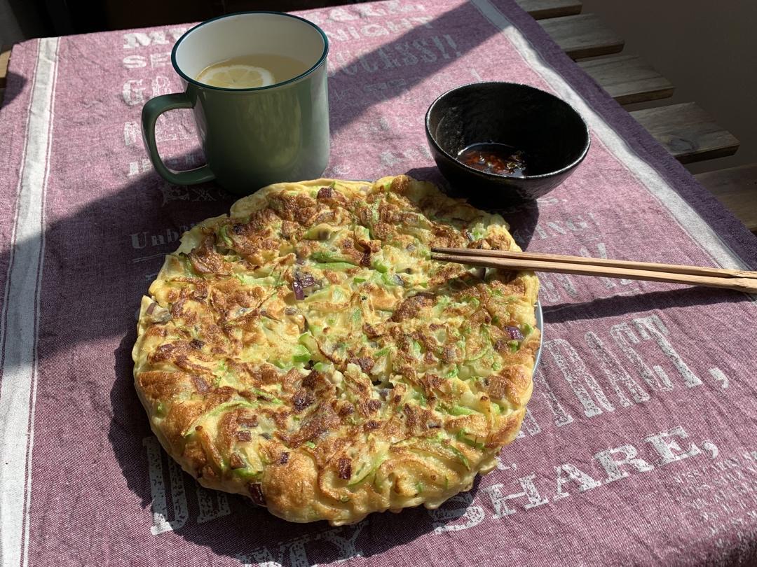 感觉不能摊太厚,难熟,翻的时候会烂掉。新手建议控水和控量。