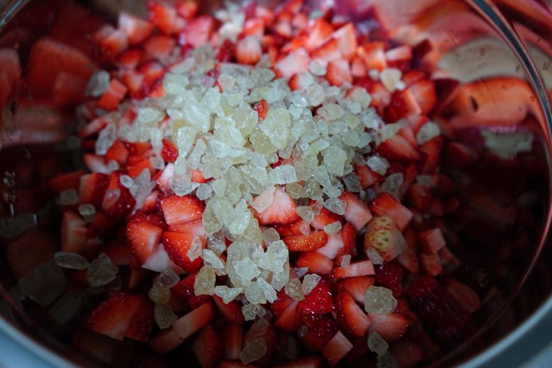 再铺一斤草莓丁、上面撒一层小粒黄冰糖