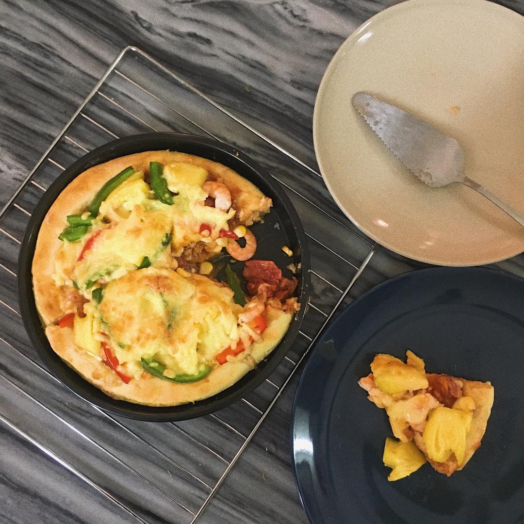SooniChi 做过 妙可蓝多 | 妙趣中餐 涨芝士 #午餐•2020年3月22日# 第一次自己做的海陆空披萨( ͡° ͜ʖ ͡°)✧ 里面有鲜虾牛肉菠萝玉米粒彩椒,先炒的红酱做的披萨酱,这个酱真的超好吃!拿来当番茄意面酱料也超🉑️!出炉后竟意外的好吃,果然芝士就是力量 ᕕ(ᐛ)ᕗ 2020-03-22