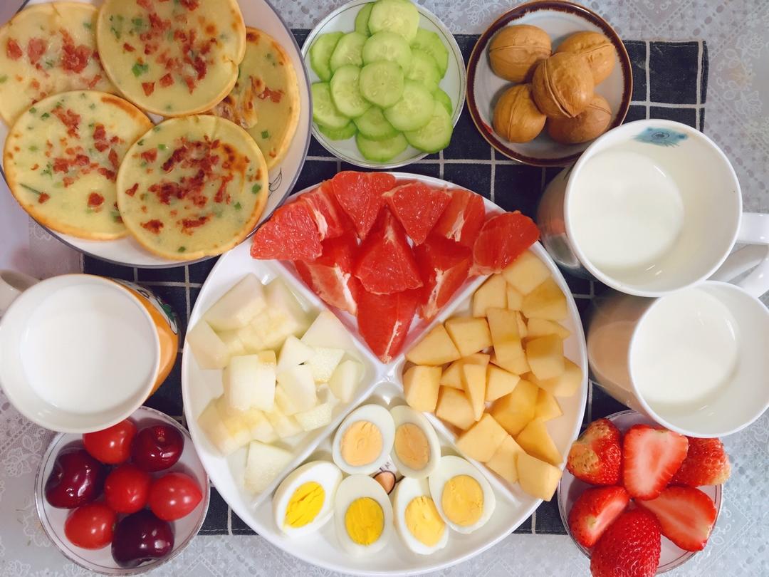 猫猫家的早餐:葱油饼、鸡蛋、牛奶、核桃、黄瓜、小番茄、车厘子、草莓、西柚、苹果、蜜瓜…
