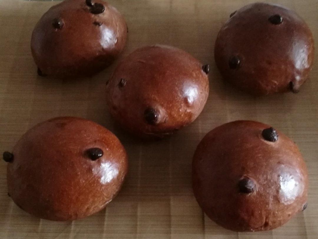心语人生 做过 黑眼豆豆面包 出炉很可爱的面包,刷了薄薄一层蛋液,亮亮的,比配方额外添加了80克老面(蒸包子剩的)和10克牛奶,里面包馅儿用的榛仁巧克力酱,比单纯的巧克力块更香滑。上火165℃,下火150℃,15分钟,没盖锡纸。一次发酵在面包机,二次发酵在烤箱。 2020-04-06