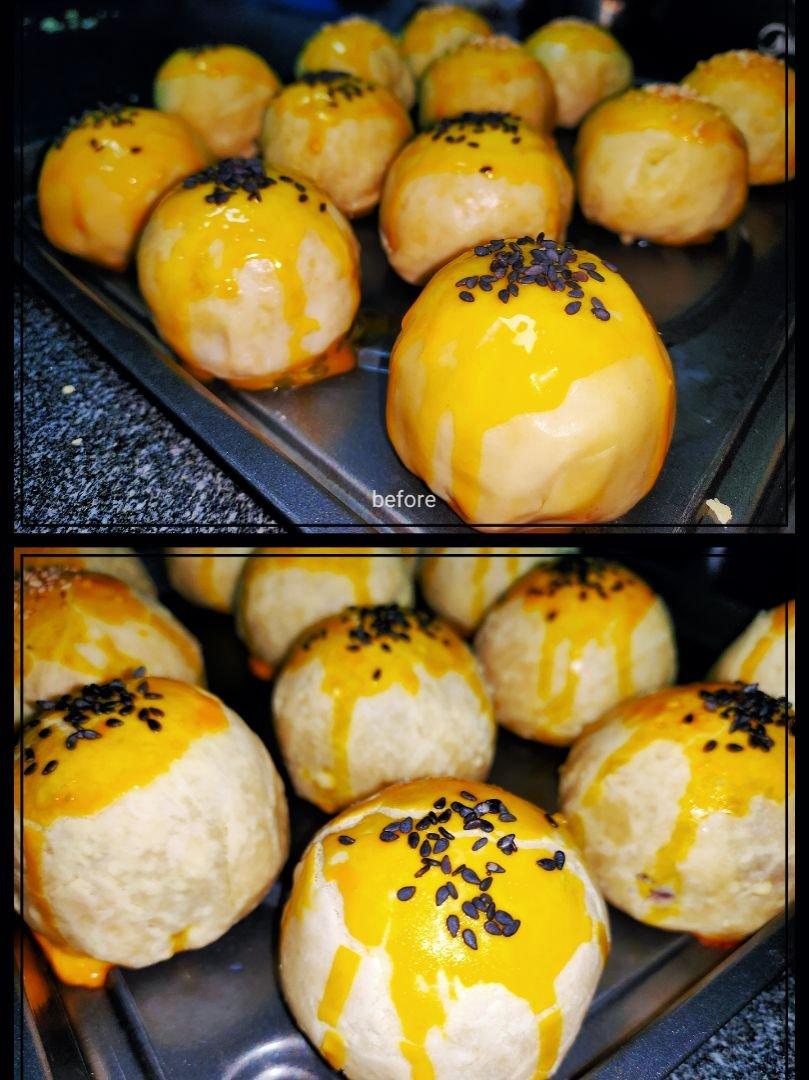 ○烤之前把每个蛋黄酥底部沾一下蛋白液,不容易破裂(但烤盘记得刷油,,别问我为什么知道🌚)